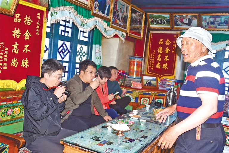 平措在家庭旅館內(nèi)招待北京來的游客。張猛 攝