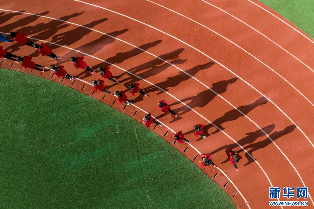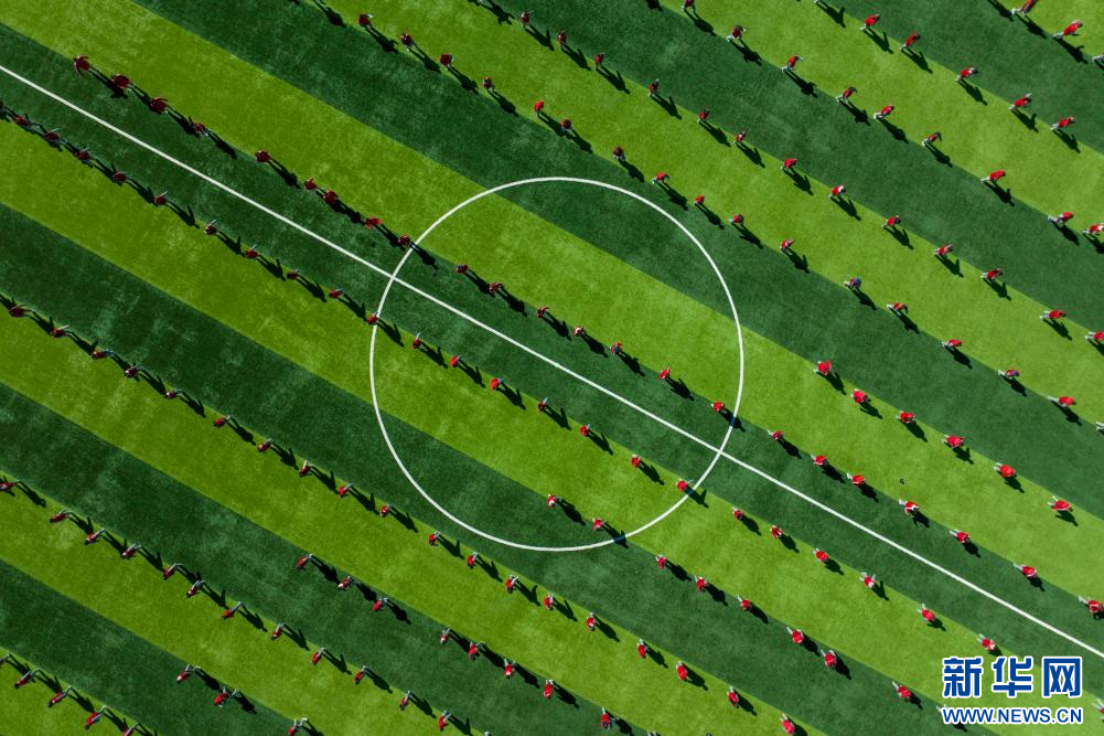 圖為那曲市第三小學(xué)學(xué)生在做體能訓(xùn)練(9月5日攝,無人機(jī)照片)。新華網(wǎng) 旦增努布 攝