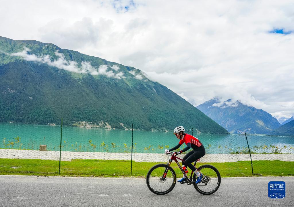 9月9日,老隊(duì)員車(chē)隊(duì)選手白瑪央吉在比賽中經(jīng)過(guò)巴松措湖區(qū)。新華社發(fā)(劉劍璞 攝)
