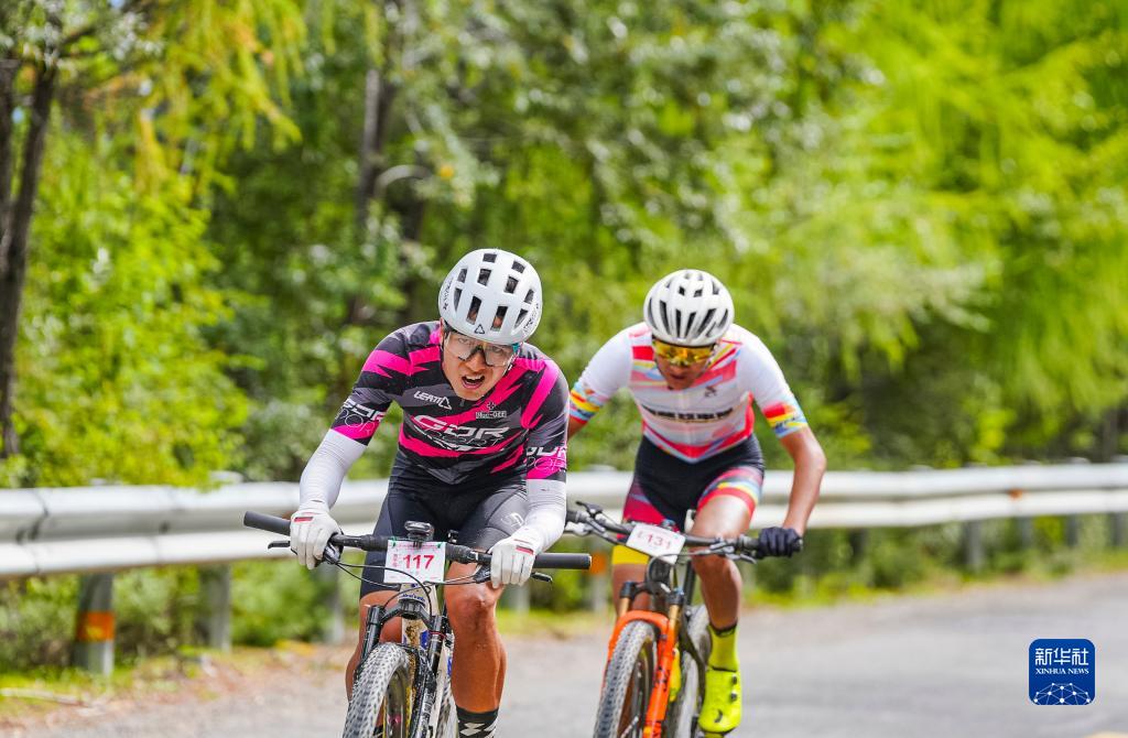 9月10日,北京GDR車(chē)隊(duì)選手黃世海(前)和亞車(chē)隊(duì)選手江村羅布在比賽中。最終,江村羅布和黃世海分獲男子組冠、亞軍。新華社發(fā)(劉劍璞 攝)