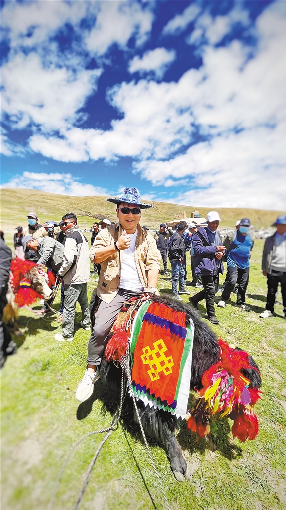圖為來自湖南的游客李先生在牧人節(jié)賽牦牛項目中,體驗騎牦牛的刺激與歡樂。見習記者 武沛濤 攝