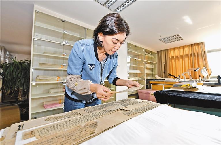 西藏自治區(qū)圖書館古籍保護(hù)中心工作人員在進(jìn)行古籍粘貼修復(fù)。唐斌 攝