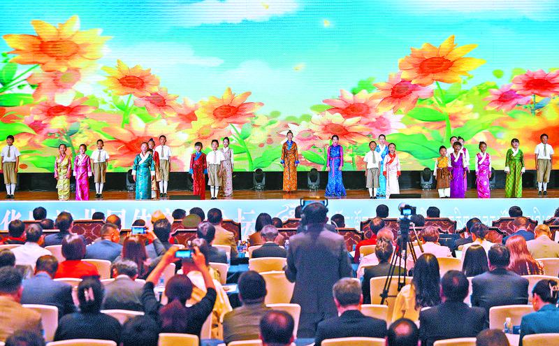 9月19日,由自治區(qū)黨委、自治區(qū)政府主辦的首屆西藏鑄牢中華民族共同體意識(shí)論壇在拉薩開(kāi)幕。圖為在開(kāi)幕式上,西藏珠峰少年合唱團(tuán)演唱《珞巴少年》。記者 潘多 攝