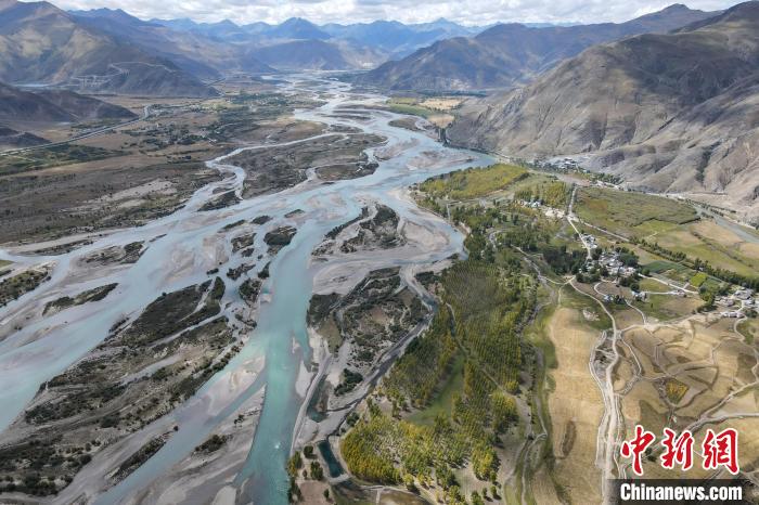 圖為9月29日,航拍拉薩河與遠(yuǎn)處河谷地帶的農(nóng)田。江飛波 攝