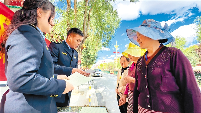 圖為山南市瓊結(jié)縣市場監(jiān)督管理局執(zhí)法人員向群眾發(fā)放知識產(chǎn)權相關宣傳冊。記者 白瑪澤旺 通訊員 倫珠澤仁 攝