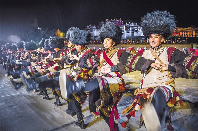 星空為幕,山川為景,氣勢(shì)恢宏,震撼心靈。直抵人心的音樂(lè)聲響起,歡快的果卓鼓聲震天,熱情的篝火升騰;打阿嘎的搗地之聲,古老藏戲的婉轉(zhuǎn)傳唱,甲諧的豪情奔放……恢弘的布達(dá)拉宮布景前,“文成公主”和“松贊干布”穿越千年而來(lái),再現(xiàn)漢藏和美的動(dòng)人傳奇。
