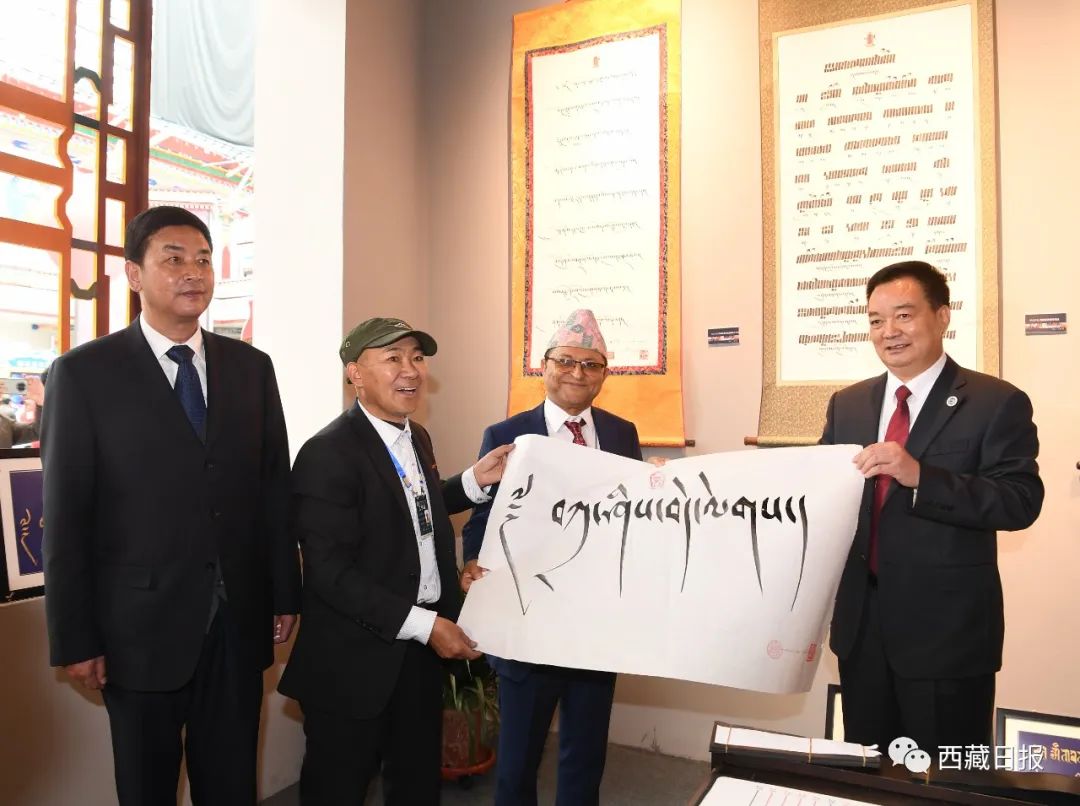這是中國(guó)西藏旅游文化國(guó)際博覽會(huì)期間,王君正向尼泊爾聯(lián)邦院主席加內(nèi)什·普拉薩德·蒂米爾西納贈(zèng)送藏文書法作品。記者 李洲 攝