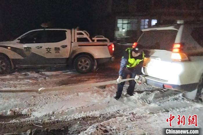 唐古拉山埡口路段入夜后氣溫極低,圖為降雪后安多警方對被困人員和車輛進行施救。安多縣公安局 供圖