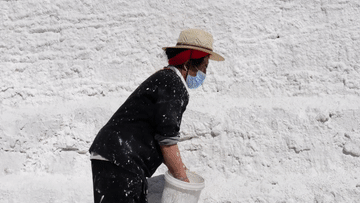 工作人員將牛奶、蜂蜜、藏紅花、白灰等材料按比例混合,經(jīng)過(guò)濾后對(duì)布宮墻體進(jìn)行噴涂,這樣既可以保護(hù)建筑物表面不受腐化變質(zhì),也可更加美觀。