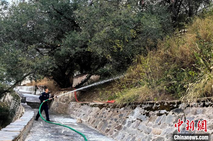布達拉宮墻體粉刷正式開始前一周,大隊每日清晨、傍晚組織指戰(zhàn)員對布達拉宮山體進行全面濕化,消除火災(zāi)隱患。劉瑜 攝