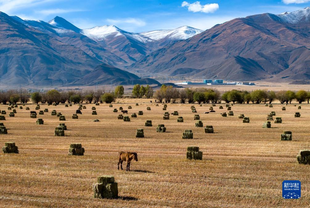 這是10月24日在拉薩市林周縣強嘎鄉(xiāng)曲嘎強村拍攝的已打包好的牧草(無人機照片)。新華社記者 姜帆 攝