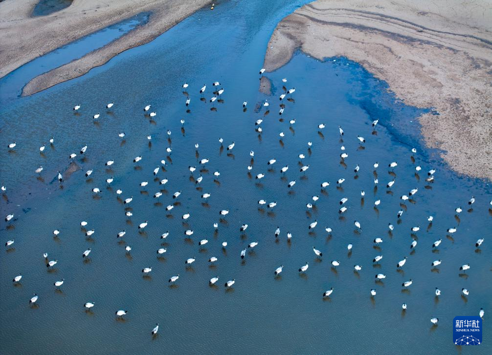 這是在拉薩市林周縣虎頭山水庫(kù)拍攝的越冬黑頸鶴(10月24日攝,無(wú)人機(jī)照片)。新華社記者 姜帆 攝