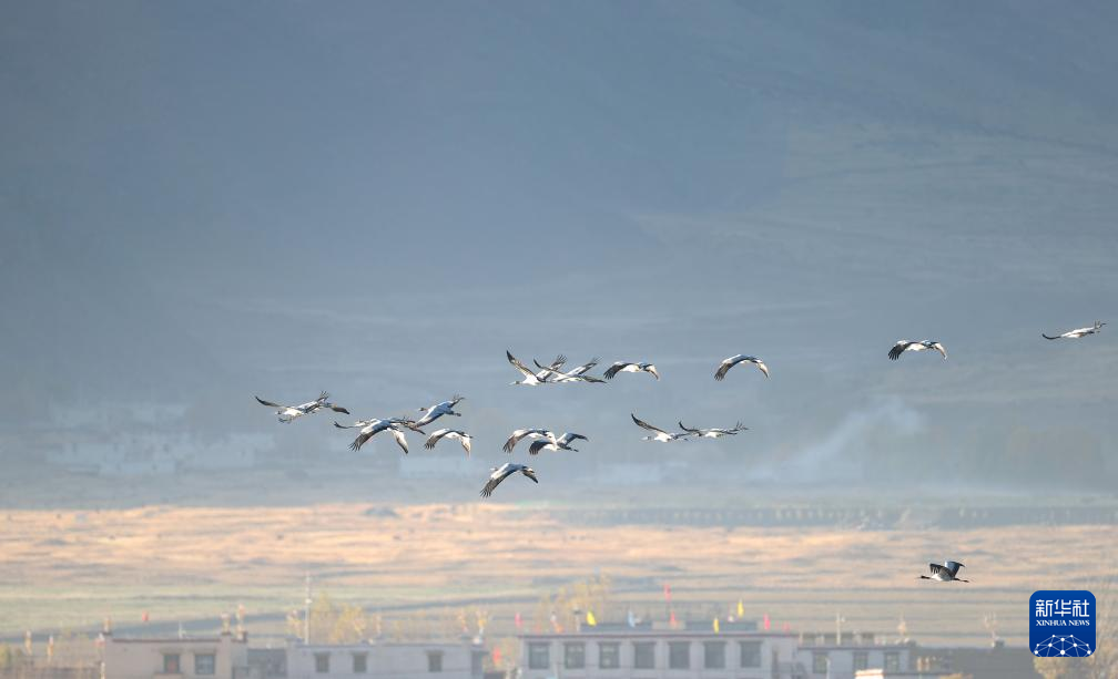 這是在拉薩市林周縣虎頭山水庫(kù)拍攝的越冬黑頸鶴(10月24日攝)。新華社記者 姜帆 攝