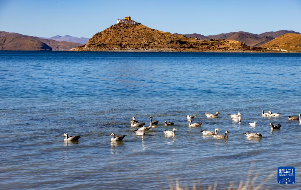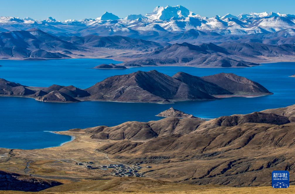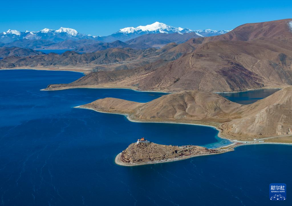 這是10月25日拍攝的羊卓雍錯和日托寺。新華社記者 姜帆 攝