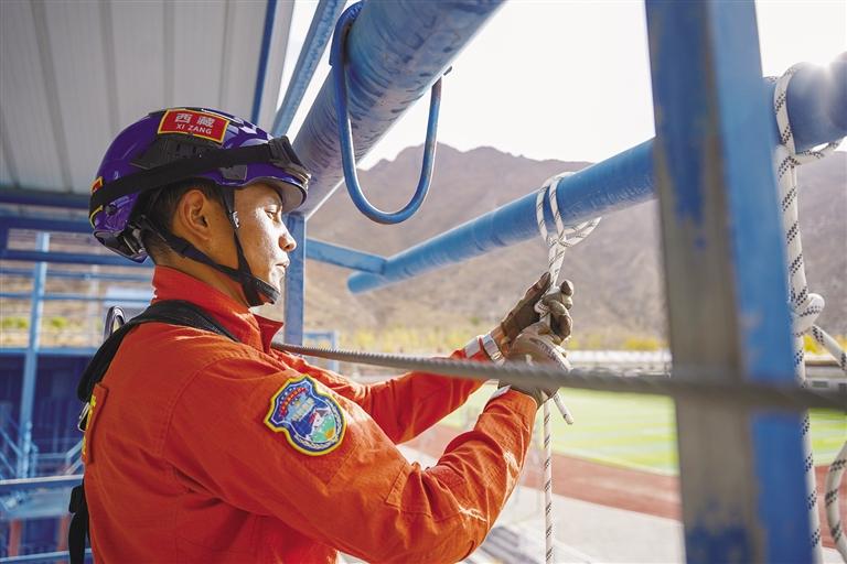 迅速打好繩結(jié)、扣好安全帶……27歲的仁增論珠身著全套戰(zhàn)訓(xùn)服,正在進(jìn)行繩索下降訓(xùn)練。身姿矯健、動作干凈利落,眨眼間,他已安全降至地面。仁增論珠從小就有個當(dāng)兵夢,2015年,他應(yīng)征入伍,三年部隊(duì)生活錘煉了他的體能和意志。2019年,仁增論珠入職自治區(qū)森林消防總隊(duì),成為一名消防戰(zhàn)士,繼續(xù)為保家衛(wèi)國貢獻(xiàn)自己的力量。