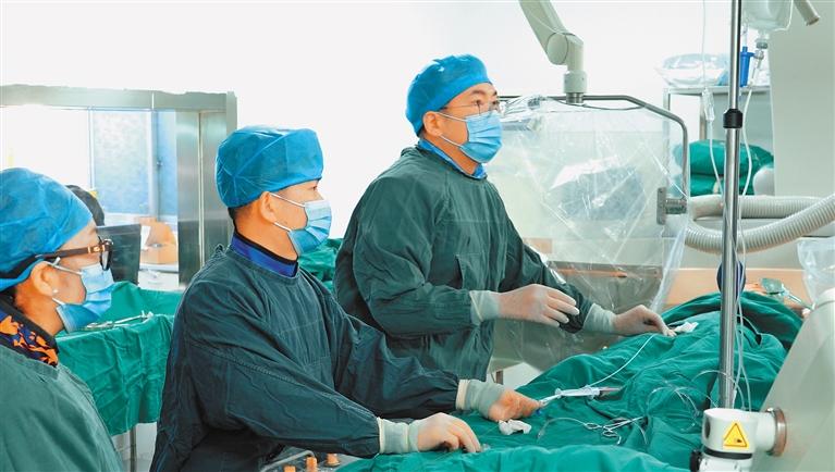 圖為援藏醫(yī)生閆朝武帶領(lǐng)本地同事在進(jìn)行介入手術(shù)治療。 李梅英 攝