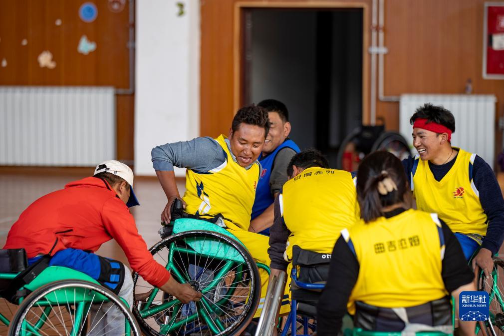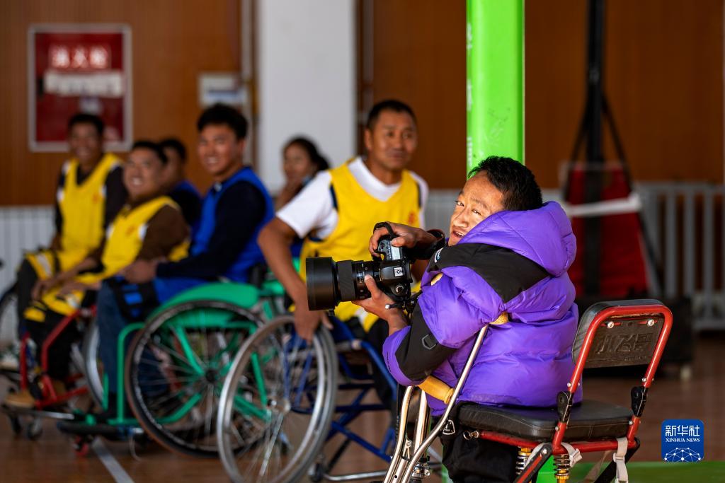 拉巴頓珠(右一)在拍攝輪椅籃球訓練(11月26日攝)。新華社記者 姜帆 攝