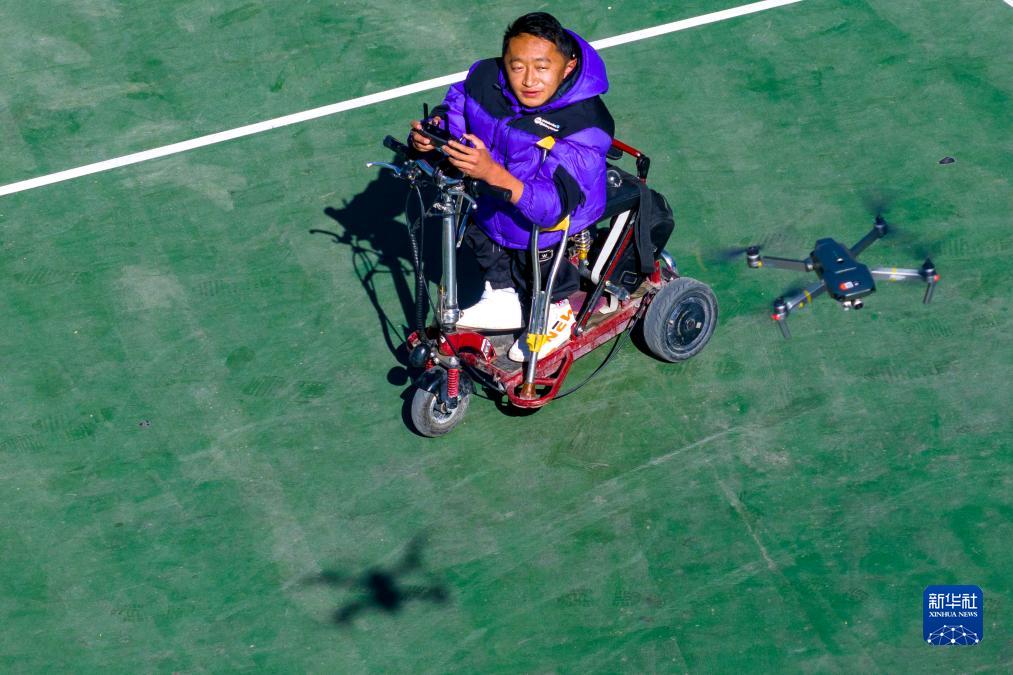 拉巴頓珠在練習操作無人機(無人機照片,12月2日攝)。新華社記者 姜帆 攝