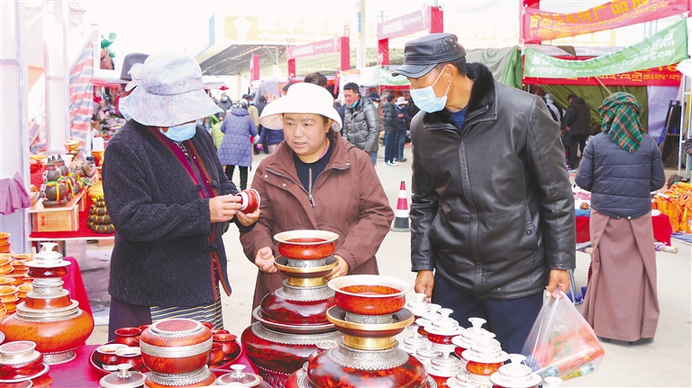 物交會(huì)現(xiàn)場(chǎng),記者看到,各式各樣的特色產(chǎn)品琳瑯滿目,有來(lái)自山南市隆子縣熱榮鄉(xiāng)加繞村的牛肚、昌都市江達(dá)縣江達(dá)鎮(zhèn)的木碗、林芝市工布江達(dá)縣的唐卡刺繡……在尼泊爾商家的攤位前,也站滿了眾多市民參觀選購(gòu)。