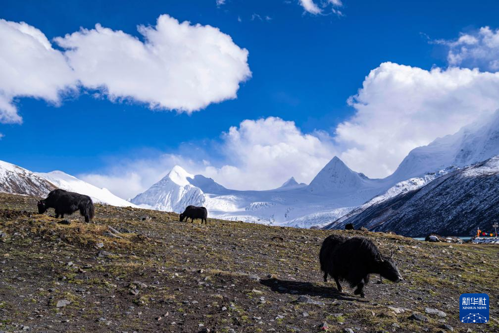 牦牛在那曲市比如縣羊秀鄉(xiāng)薩普雪山腳下的草場上吃草(10月28日攝)。新華社記者 孫非 攝