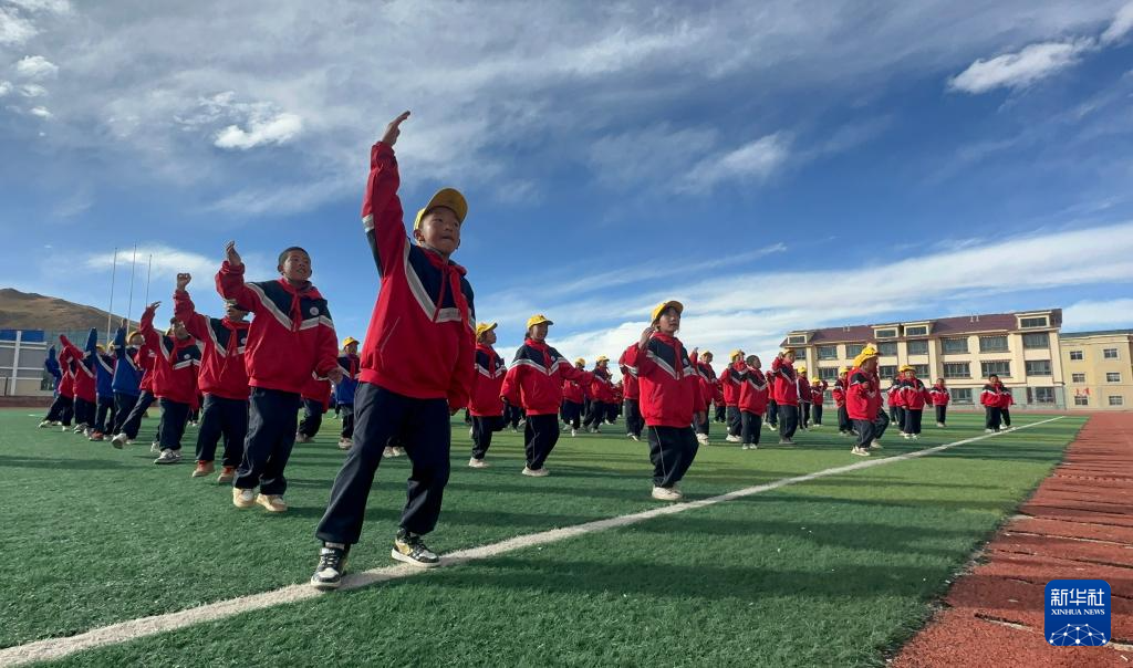 10月13日,在西藏那曲市班戈縣中石化小學,學生在操場上跳“班戈諧欽”課間操。新華社發(fā)(孔琳琳 攝)