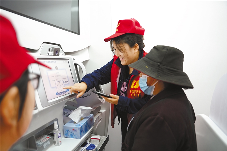 圖為大古公司員工在健康亭一體機(jī)前幫助達(dá)古村村民進(jìn)行體檢。記者 武沛濤 攝