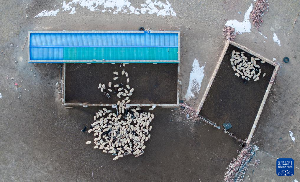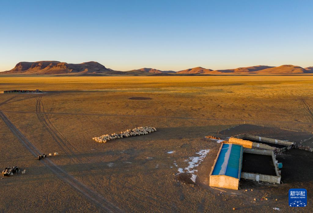 太陽落山,丹增家的羊回到棚圈。其中左側(cè)藍頂?shù)氖侨ツ晷律w的封閉式棚圈,右側(cè)是傳統(tǒng)的敞開式羊圈(無人機照片,12月18日攝)。新華社記者 姜帆 攝