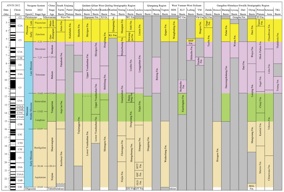 中國的新近紀(jì)年代地層系統(tǒng)分為中新統(tǒng)的謝家階、山旺階、通古爾階、灞河階、保德階5個(gè)階,以及上新統(tǒng)的高莊階和麻則溝階2個(gè)階。研究提出,在青藏高原新生代陸相地層的劃分對比和測年標(biāo)定上,哺乳動(dòng)物化石起到非常重要的作用。