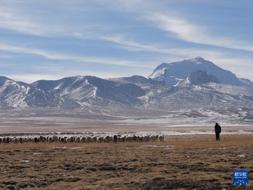 當(dāng)?shù)啬撩裨谘┥侥_下放牧(12月20日攝)。新華社記者 洛卓嘉措 攝