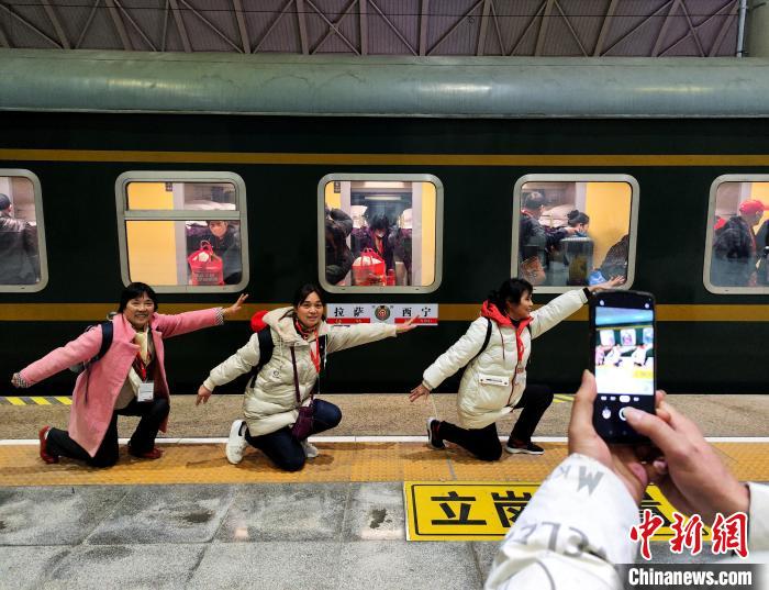 2023年3月1日,乘坐首趟進藏旅游專列的旅客與列車合影。楊紅健 攝