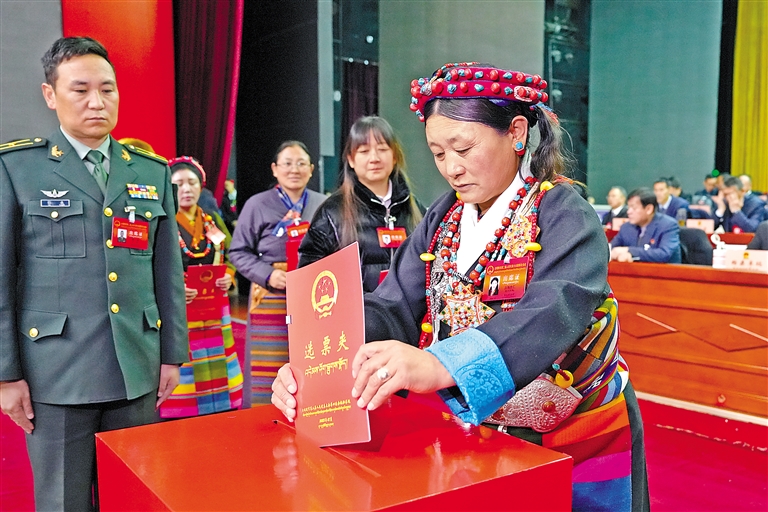 圖為日喀則市第二屆人民代表大會(huì)第四次會(huì)議主席團(tuán)第一次會(huì)議主席團(tuán)成員舉手表決。