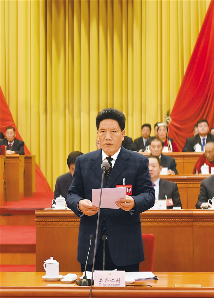 王君正陳永奇劉江等在主席臺(tái)就座 洛桑江村主持大會(huì) 嚴(yán)金海作政府工作報(bào)告