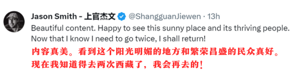 此外,新西蘭媒體人安柏然、《沙特阿拉伯新聞》記者賈邁勒·杜巴希、愛沙尼亞-中國商會主席達(dá)維德·維克托、美國反戰(zhàn)人士克里斯蒂·富蘭克林,我駐馬爾代夫大使館和駐意大利、英國、巴基斯坦外交官轉(zhuǎn)贊評,紛紛對西藏的美麗景色和深厚文化表示贊賞。