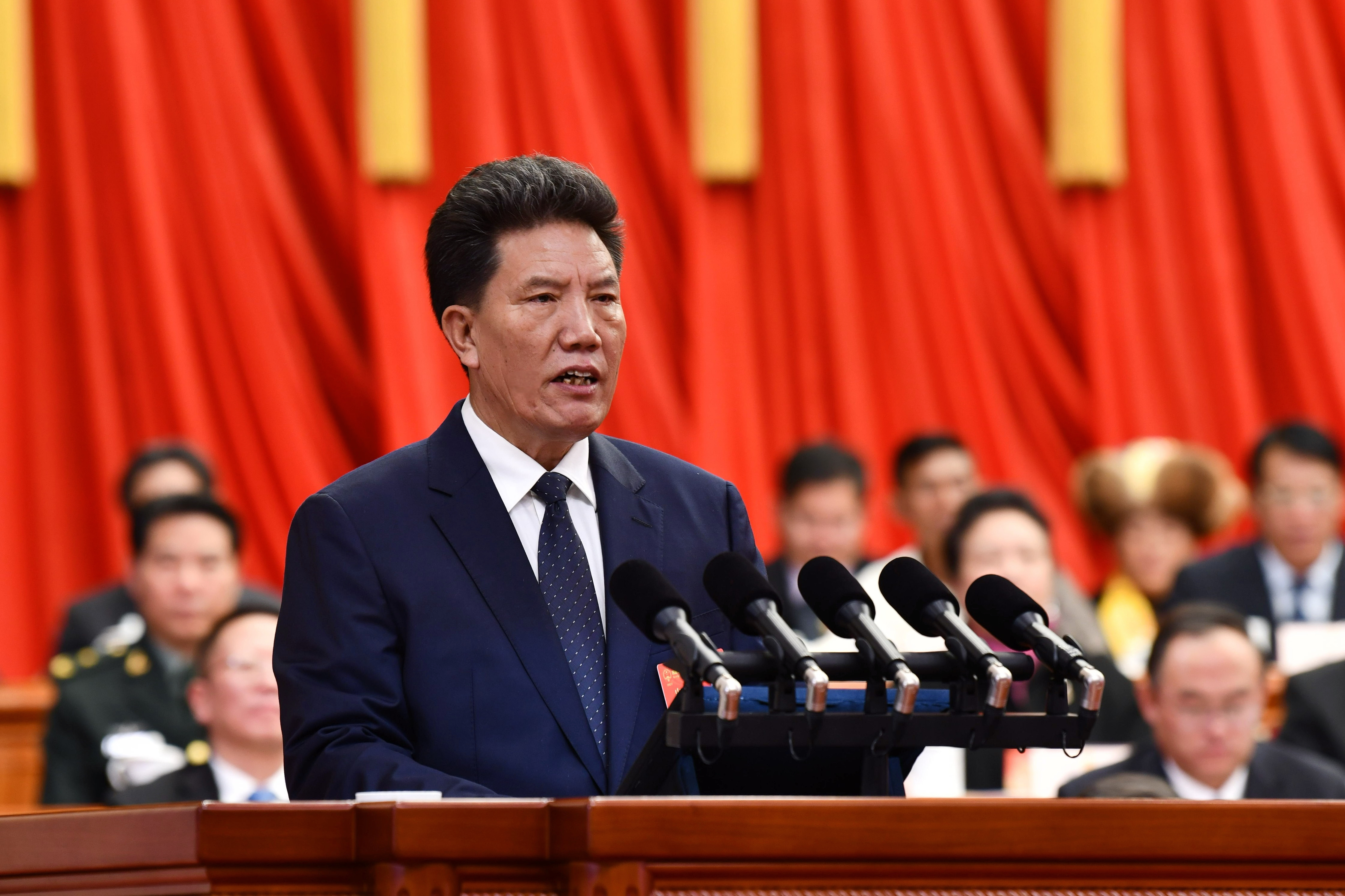 全國(guó)人大常委會(huì)副委員長(zhǎng)、自治區(qū)人大常委會(huì)主任洛桑江村向大會(huì)作自治區(qū)人大常委會(huì)工作報(bào)告。記者 次仁平措 攝