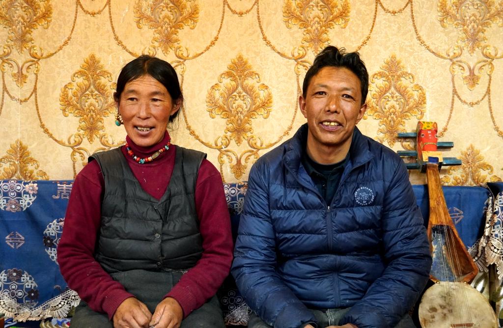 札達(dá)縣楚魯松杰鄉(xiāng)巴卡村巴角組村民歐珠多吉夫婦在新房客廳合影(1月14日攝)。新華社記者陳尚才 攝