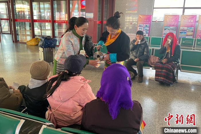 圖為春運(yùn)首日,西藏日喀則火車站工作人員為旅客送上甜茶。金耀勛 攝