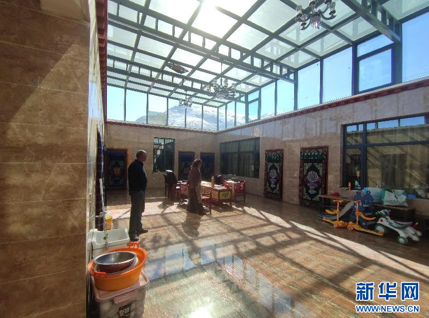 村民貢嘎是克日村第二批“美麗鄉(xiāng)村·幸福家園”建設(shè)行動(dòng)計(jì)劃的參與者,翻新房子70%的費(fèi)用由當(dāng)?shù)卣a(bǔ)貼,自己只需支付30%,如今房屋已改造完畢,一家子正式入住。孫子們?cè)诠鉂嵉牡孛嫱嫠?,和煦的?yáng)光從屋頂?shù)年?yáng)光棚照進(jìn)客廳,溫暖了整個(gè)冬天。