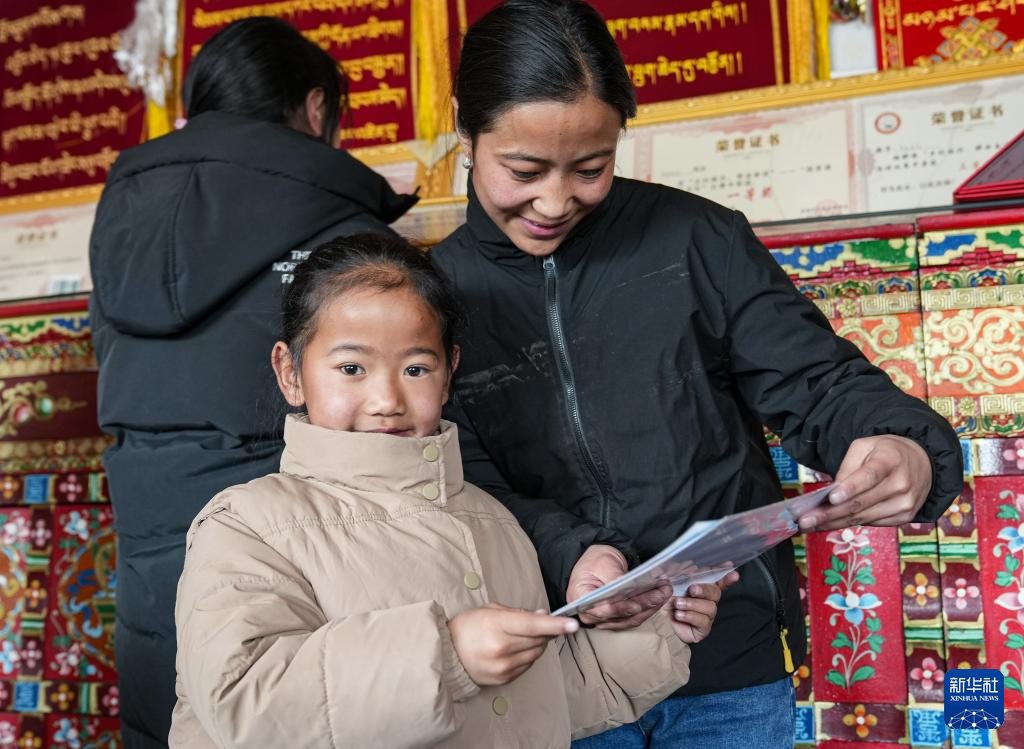 阿歐的外孫女云丹秋措向媽媽展示她自己獲得的獎(jiǎng)狀(1月31日攝)。新華社記者 晉美多吉 攝