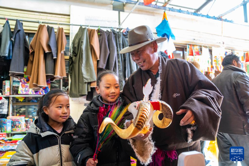 在當(dāng)雄縣的年貨市場(chǎng),索朗羅達(dá)(右)和孫女們正在選購(gòu)羊頭(2月3日攝)。新華社記者 孫非 攝