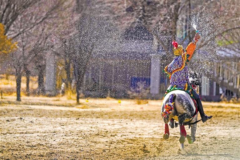 手捧潔白的哈達和鮮花,騎手們揚鞭策馬走上賽場,用策馬奔騰、賽場競技和騎馬拾哈達、騎馬射箭等精彩表演,為觀眾送上新年的祝福。