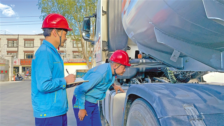 中國石油運(yùn)輸西藏分公司工作人員在對油罐車輛進(jìn)行安全檢查。記者 次仁平措 通訊員 格桑旦增 攝