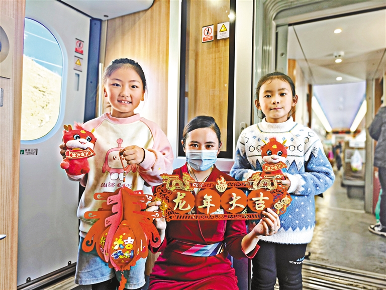 春運(yùn)期間,鐵路部門踐行“天路格?;ā狈?wù)品牌理念,將車站、列車裝飾一新,為旅客提供優(yōu)質(zhì)、貼心的服務(wù)。圖為拉林鐵路動車組上的乘務(wù)員把龍年禮物送給孩子們。