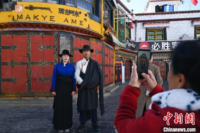 圖為大年初一,游客在八廓古城“網(wǎng)紅”地標(biāo)拍照打卡。趙朗 攝
