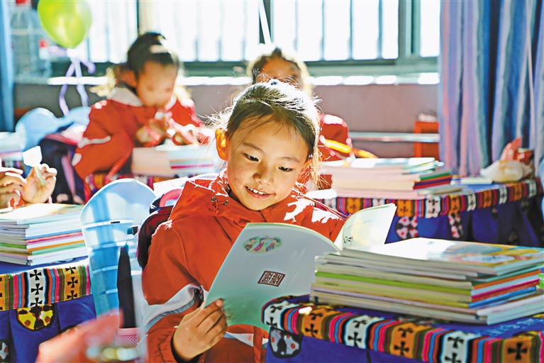 阿里地區(qū)陜西實驗學(xué)校開學(xué)第一天,孩子們開心閱讀新課本。記者 洛桑旦增 達珍 永青 攝
