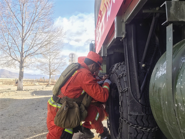 指戰(zhàn)員們進(jìn)行車輛防滑安裝考核。記者 桑旦歐珠 攝