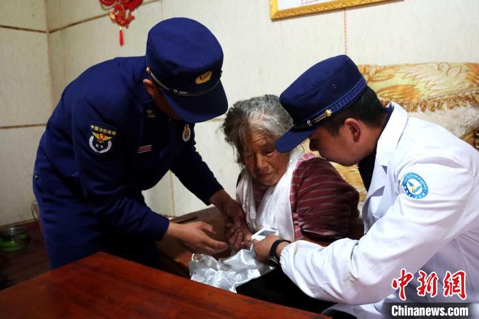 圖為消防救援人員為孤寡老人測量血壓。吳蕾蕾攝