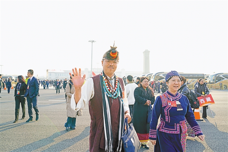 住藏全國政協(xié)委員達(dá)珞(左)下車步入會場。