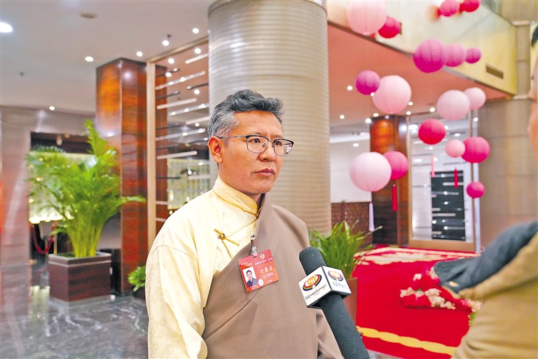 會議期間,住藏全國政協(xié)委員達(dá)瓦頓珠在委員駐地接受媒體采訪。