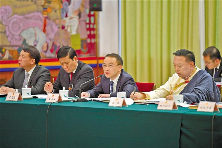 圖為西藏全國人大代表王方紅(右二)在西藏代表團(tuán)全體會議上發(fā)言。