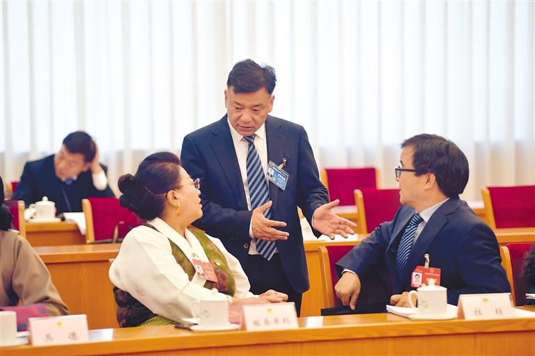 圖為西藏全國人大代表在會議間隙溝通交流。